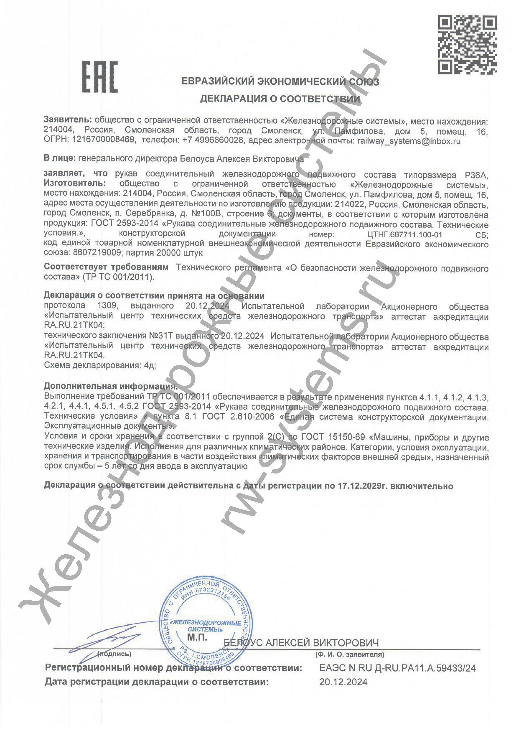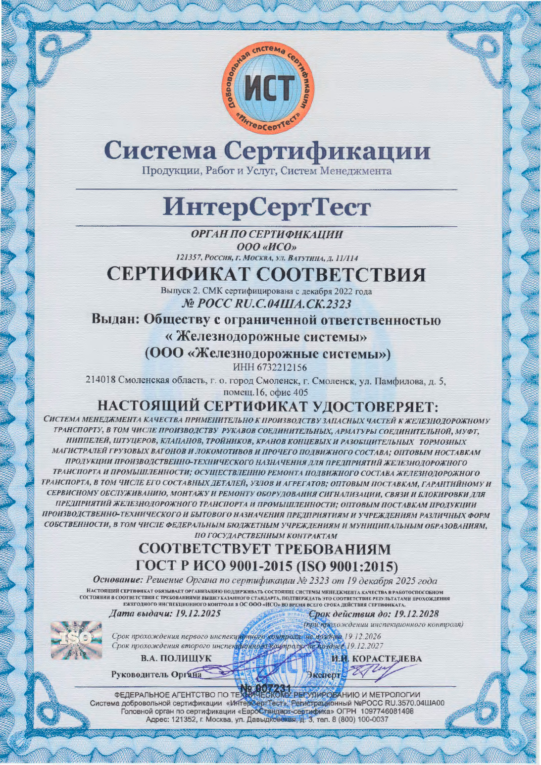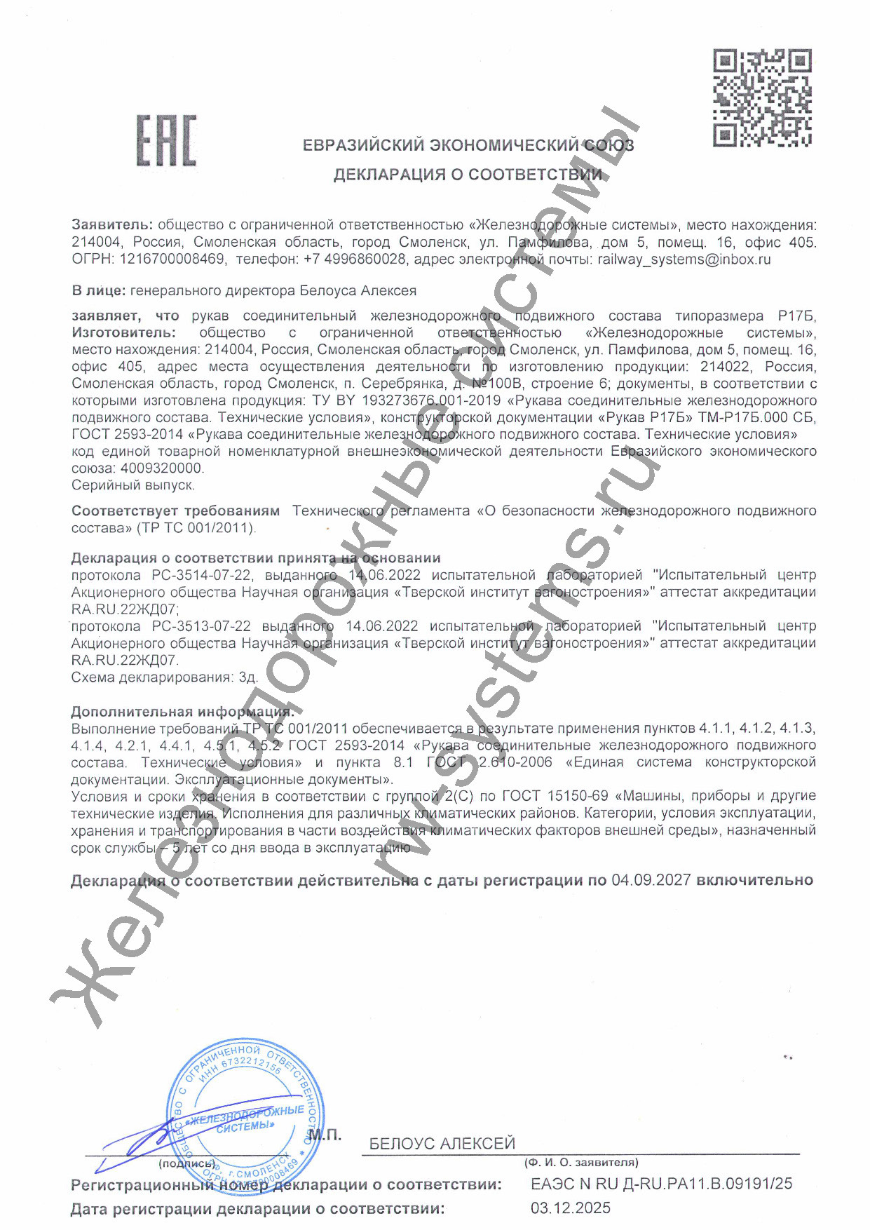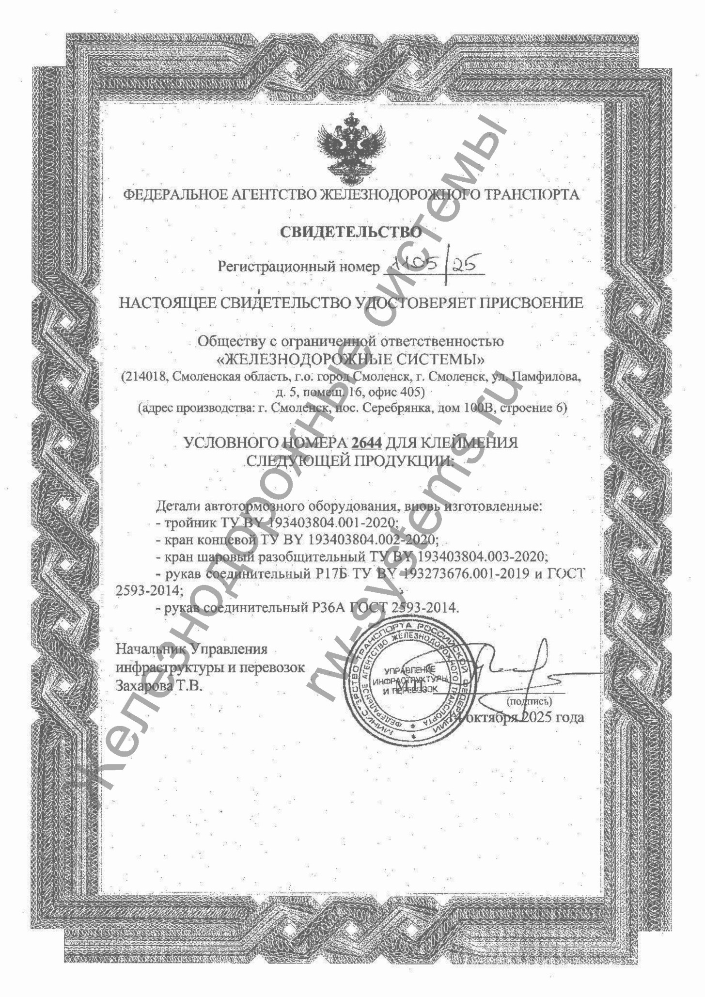 Общество с ограниченной ответственностью "Железнодорожные системы" является производителем арматуры соединительной для безрезьбовых соединений, кранов концевых, кранов шаровых разобщительных и рукавов соединительных типоразмеров Р17Б и Р36А ГОСТ 2593-2014 для пневматических систем подвижного состава железных дорог.