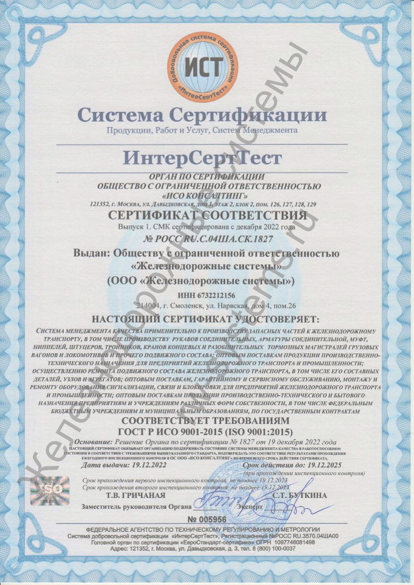 Общество с ограниченной ответственностью "Железнодорожные системы" является производителем арматуры соединительной для безрезьбовых соединений, кранов концевых, кранов шаровых разобщительных и рукавов соединительных типоразмеров Р17Б и Р36А ГОСТ 2593-2014 для пневматических систем подвижного состава железных дорог.